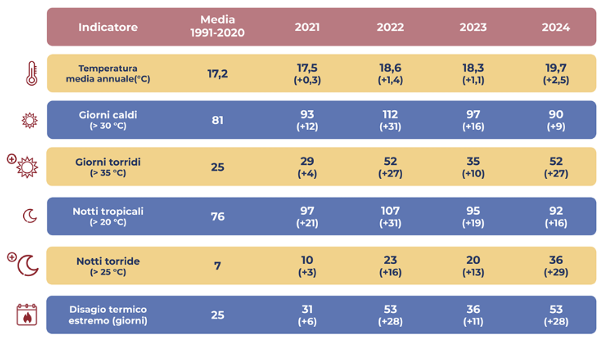 Figura 4. La tabella mostra la variazione di alcuni indicatori negli ultimi anni rispetto alla media degli anni 1991-2020. In particolare, sono stati considerati: la temperatura media (T), i giorni caldi (T > 30 °C), i giorni torridi (T > 35 °C), le notti tropicali (Tmin > 20 °C), le notti torride (Tmin > 25 °C) e l’indice di disagio termico estremo (n° giorni con temperatura e umidità elevate).