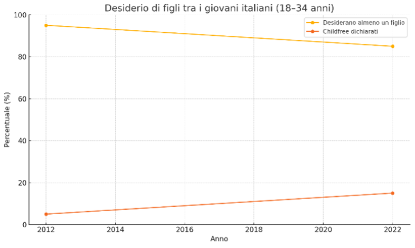 In Italia, il tema si intreccia con un lungo processo di transizione demografica. Il tasso di fecondità è passato da 1,42 figli per donna nel 2008 a 1,2 nel 2023. Se un tempo il problema era la difficoltà ad avere figli per ragioni economiche, oggi si sommano fattori culturali e sociali. Come evidenziato dalla ricercatrice Francesca Luppi, demografa e ricercatrice dell’Università Cattolica del Sacro Cuore di Milano, nelle economie avanzate sta avvenendo un cambiamento generazionale nelle preferenze: i dati del Rapporto Giovani 2024 dell’Istituto Toniolo dicono che dal 2012 al 2022 la quota di giovani tra i 18 e i 34 anni che dichiarano di voler almeno un figlio è scesa dal 95% all’85%, e che è cresciuta la percentuale di chi si dichiara esplicitamente childfree (15% nel 2022), con un’incidenza maggiore tra le donne (18%) rispetto agli uomini (12%).