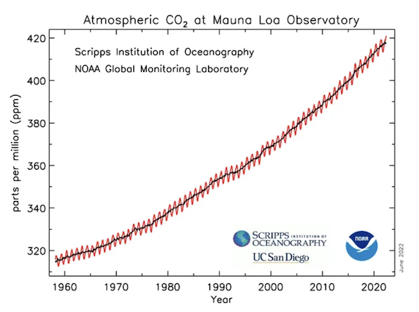Andamento della concentrazione del diossido di carbonio in atmosfera, curva di Keeling, misurato dal 1958 a oggi nella stazione di Mauna Loa. Dopo un periodo iniziale nel quale Keeling stesso condusse i rilevamenti, la conduzione delle operazioni venne poi, dai primi anni ’60, affidata alla NOAA.