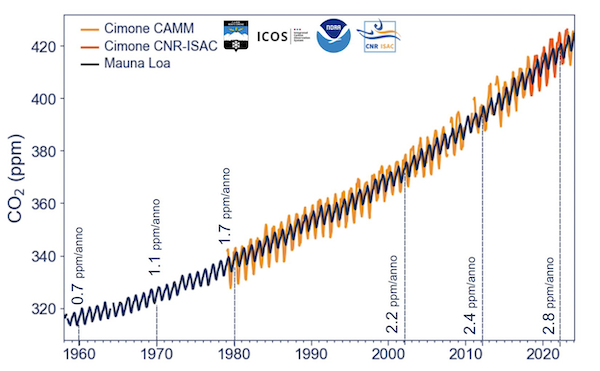 Qui dal 1979 il Centro Aeronautica Militare di Montagna (CAMM) misura, in collaborazione e con le stesse tecnologie della NOAA, la concentrazione di CO2 in atmosfera. A queste misure si sono aggiunte dal 2018, in stretto accordo con il CAMM, le misure dell’Istituto di Scienze dell’Atmosfera e del Clima del Consiglio Nazionale delle Ricerche (ISAC-CNR). Il grafico della Fig. 3 riporta l’andamento sovrapposto delle misure di Mauna Loa e di Monte Cimone che seguono lo stesso andamento di crescita della concentrazione di CO2 in atmosfera.