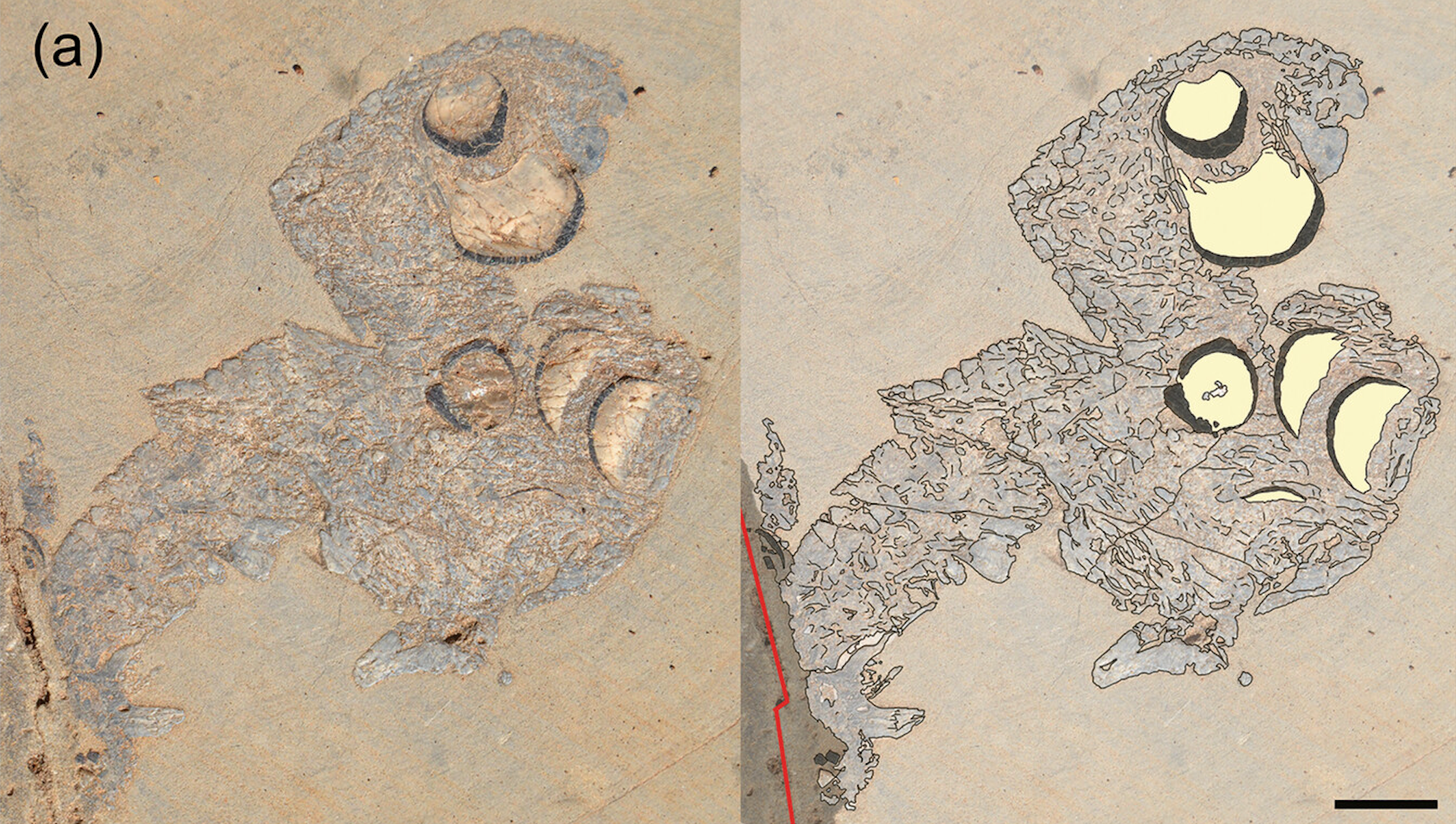 Nell'immagine: fotografia del fossile di Acynodon adriaticus (a sinistra) e sua interpretazione grafica (a destra). Crediti: Muscioni M, Chiarenza AA, Fernandez DBH et al (2024). Cranial anatomy of Acynodon adriaticus and extreme durophagous adaptations in Eusuchia (Reptilia: Crocodylomorpha). The Anatomical Record, 307(12), 3653–3684. Licenza: CC BY 4.0
