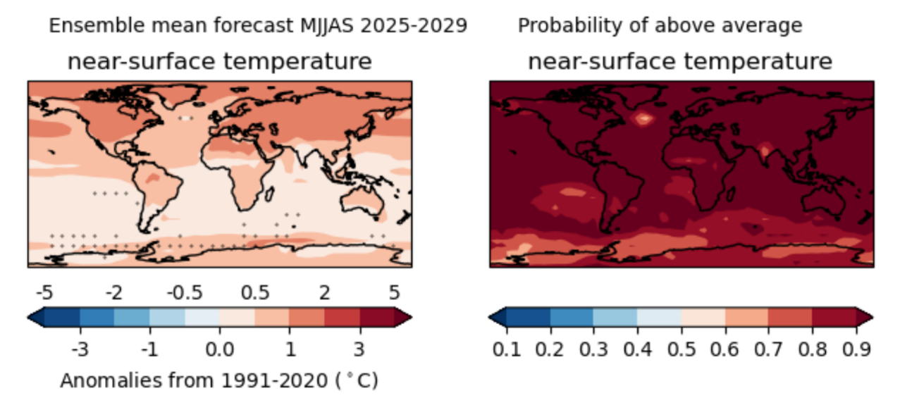 Secondo le previsioni climatiche della World Meteorological Organization (WMO) in quasi tutte le regioni terrestri ed oceaniche ci sarà un aumento delle temperature per il quinquennio 2025-2029 (mesi maggio-settembre), con una probabilità dal 60% in su. A sinistra: l’anomalia media prevista della temperatura in prossimità della superficie terrestre rispetto al periodo 1991-2020. A destra: la probabilità che le temperature risultino superiori alla media storica.