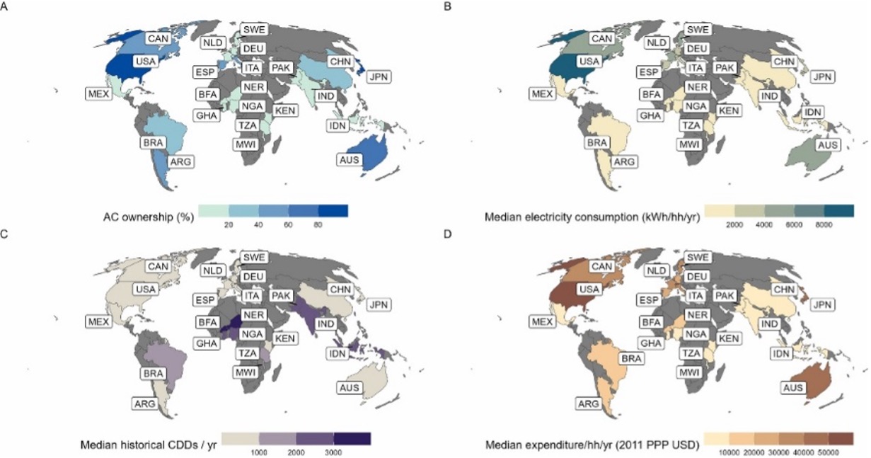 In base alle due variabili analizzate, una famiglia consuma in media 2.439 kilowattora (kWh) all’anno, mentre la prevalenza dell'aria condizionata è di circa il 26%. Un dato paradossale è che i paesi con climi caldi e umidi, come l’Africa e il Sud-Est asiatico, utilizzano una quantità più bassa di elettricità e optano per soluzioni come ventilatori e raffrescatori evaporativi (che hanno una scarsa efficacia). Nelle aree dove l’aria condizionata è poco diffusa (come Africa, Brasile, Indonesia, India, Messico e Pakistan), le famiglie che la utilizzano finiscono per spendere una quota di elettricità pari all’intero consumo di una famiglia media. Nei paesi industrializzati come Stati Uniti, Giappone e Australia, che hanno la maggiore proprietà di aria condizionata, le famiglie medie utilizzano la quantità maggiore di energia e consumano circa cinque volte di più di una famiglia media (di dimensioni maggiori) in un paese in via di sviluppo. Inoltre, i livelli di sviluppo economico stanno determinando una relazione inversa tra urbanizzazione e consumo di elettricità. Per esempio, negli Stati Uniti il consumo medio di elettricità delle famiglie rurali supera quello delle famiglie urbane di circa il 50%. Ciò è dovuto alle maggiori dimensioni delle abitazioni e alla minore efficienza dei materiali da costruzione e degli elettrodomestici. Al contrario, in un paese in via di sviluppo come l’India, dove il tasso di urbanizzazione si attesta a circa il 36%, la domanda media di elettricità delle famiglie rurali è pari alla metà del consumo residenziale medio nazionale.