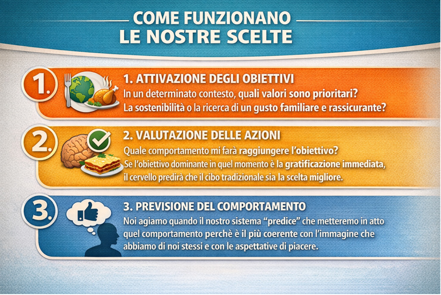 La nostra ricerca conferma che l’informazione razionale è necessaria, ma raramente sufficiente. Molti partecipanti riconoscono il valore ecologico degli insetti, eppure faticano a tradurre questa consapevolezza in una scelta alimentare reale. Questa discrepanza — nota come value-action gap — è spiegabile con il modello Goal-Directed Predictive Processing (GDPP): il cervello non è un semplice elaboratore di dati, ma una "macchina predittiva" che cerca di minimizzare l'incertezza. Non mangiamo ciò che riteniamo “giusto”, ma ciò che il cervello predice essere coerente con i nostri scopi e la nostra identità. Se l’idea di un insetto genera una previsione di disgusto, il sistema bloccherà l'azione nonostante la consapevolezza etica.