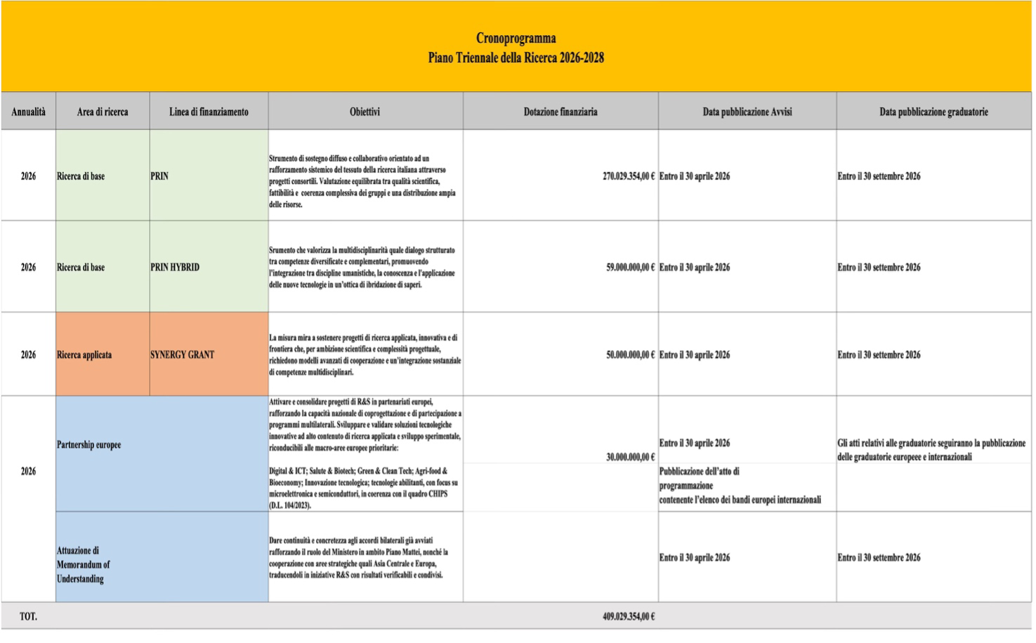 Alla fine di gennaio, quasi alla chetichella, è stato pubblicato un decreto che numerosi accademici spesso critici nei confronti del MUR non hanno esitato a definire “rivoluzionario” (l’autore di questo articolo ne ha scritto per una testata in inglese su abbonamento, e per la sua newsletter gratuita scienza senza maiuscola). Il decreto contiene il nuovo Piano Triennale della Ricerca 2026-2028, che non solo definisce già da ora le somme allocate in ciascuno dei prossimi sei anni, ma chiarisce anche quali bandi saranno aperti entro la fine di aprile da qui alla fine del 2028, con i rispettivi importi e una promessa di tempi di completamento delle graduatorie a dir poco incredibili: le scadenze sono talmente ravvicinate da suggerire di far loro un po’ di tara, perché l’eventuale completamento entro settembre dello stesso anno, come previsto dal cronoprogramma, sarebbe semmai motivo di profonda inquietudine.