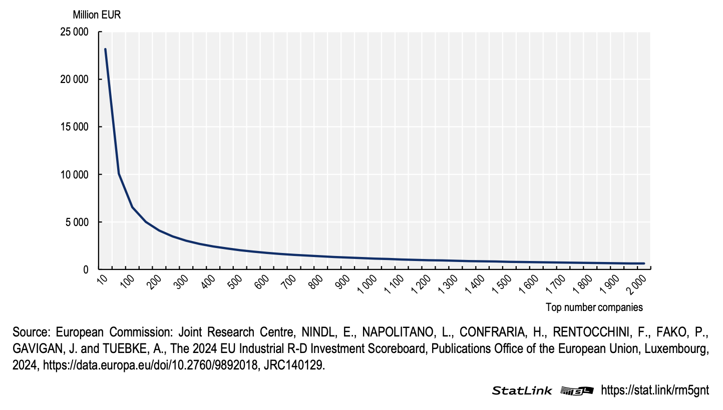 Investimenti medi in R&S delle prime 2000 aziende mondiali, 2023. Il grafico illustra la concentrazione degli investimenti privati in poche grandi imprese tecnologiche. Fonte: OCSE (2025), basato su dati S&P CapitalIQ.