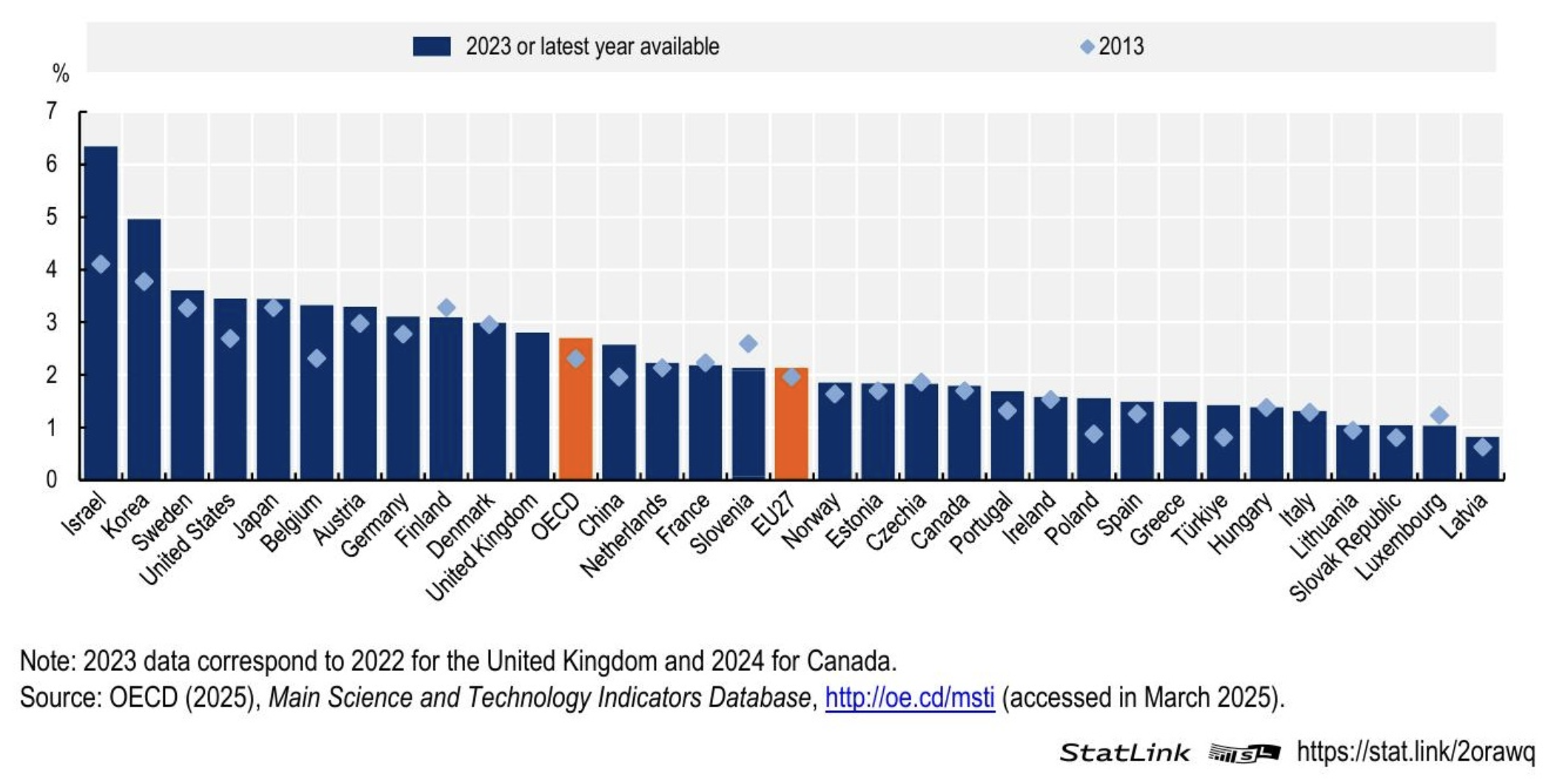 Intensità di R&S in percentuale del PIL, paesi selezionati, 2013 e 2023. Le barre arancioni evidenziano la media OCSE e l’UE27. Fonte: OCSE (2025), Main Science and Technology Indicators Database.