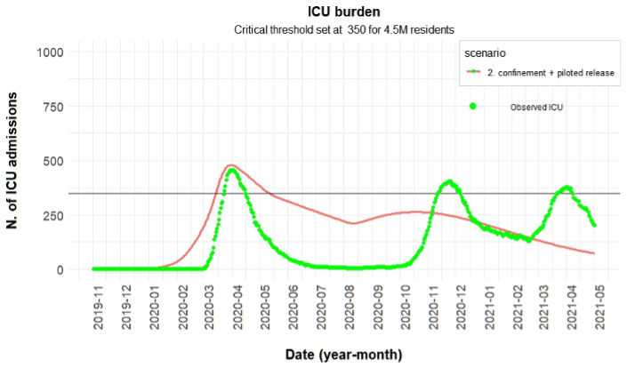In figura 1 quindi confrontiamo l’andamento dei ricoveri nei reparti di cura intensiva (curva rossa), stimato dallo scenario 2, ovvero quello a rilascio progressivo delle misure di isolamento, più simile a quanto avvenuto, con i dati reali smussati con media mobile di ricovero in unità intensiva nello stesso periodo (curva verde), come forniti dal sito ministeriale. Inoltre, il livello di soglia critica di disponibilità di letti attrezzati in cura intensiva è stato ridotto 350 letti, più vicino a quanto realmente osservato in Piemonte.