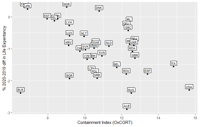 Come esercizio dimostrativo, si propone in figura 2 un’analisi della variazione percentuale degli anni di vita nel 2020 rispetto al 2019 per i paesi europei includendo anche USA e Giappone e per l’indice di “contenimento” OxCGRT (media 2020), come calcolato nell’articolo di analisi del database OMS.