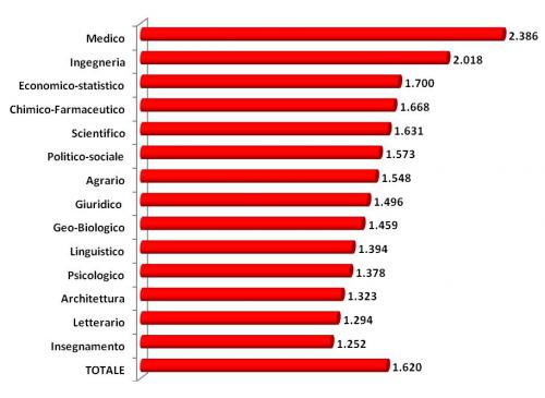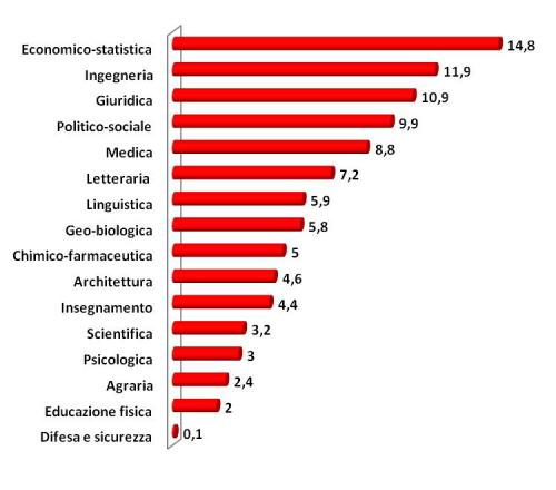 Il grafico 1 mostra come la distribuzione delle immatricolazioni universitarie sia solo in parte coerente con le considerazioni a cui conducono le rilevazioni ufficiali. Non tutte le lauree assicurano infatti la possibilità di trovare un’occupazione soddisfacente o coerente con il proprio titolo di studio. Secondo i dati forniti dall’Istat le discipline più premiate nel mercato del lavoro sono quelle tecnico-scientifiche, in particolare ingegneria e statistica, mentre la sfera dei laureati delusi risulta largamente composta dai mancati avvocati (Istat, 2011).