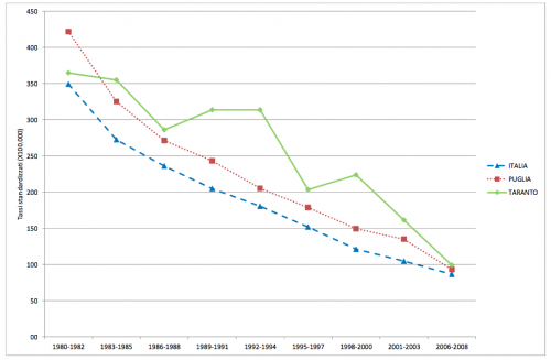 Until the 90s, mortality rates in Taranto for diseases of the circulatory system were significantly lower compared to both Italian values and those of Puglia. Considering ischemic heart diseases, mortality in Taranto follows the same general decreasing trend observed in Italy and in Puglia. Mortality from ischemic heart disease among women shows an historically declining trend in Italy, which is observed both in Puglia and Taranto, the latter's levels, however, are consistently higher than those in Puglia and in Italy (in a significant manner as from the 1998 to 2000 period).