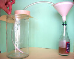 L’aceto va versato poco per volta, senza agitare. Quindi si preme il tubo nel collo dell’imbuto e si agita gradualmente, in modo da controllare la schiuma ed evitare che vada a finire nel tubo. Il gas attraverserà l’ovatta ed entrerà nel barattolo, stratificandosi dal basso e scacciando l’aria dalla sommità.