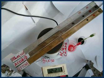 Le quattro barrette oblique sono di ottone, rame, alluminio e acciaio. Alle estremità ci sono dei piccoli fori su cui far aderire le gocce di cera fusa.