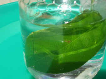 Il modo più semplice per vedere l'ossigeno prodotto dalle foglie è di fare come in queste foto. Le foglie, sia quella esposta al sole, sia quella tenuta al buio, sono immerse in acqua di rubinetto. L'esperienza è durata appena mezz'ora... e i risultati si vedono!